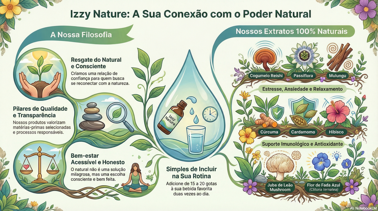 Extratos (Gotas): Nossos extratos (como Mulungu, Juba de Leão e Reishi) são de alta concentração. Recomendamos ler a descrição individual na página de cada produto para verificar a dosagem sugerida e diluir em água ou suco, conforme orientação.