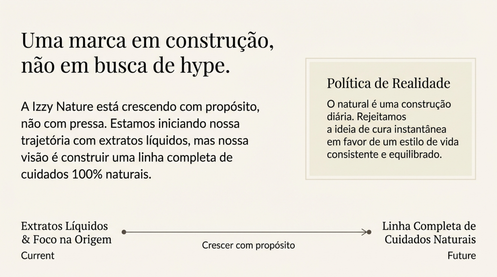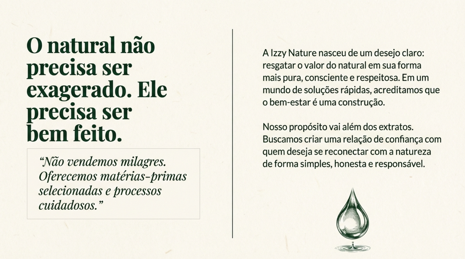 A Izzy Nature nasceu do desejo de resgatar o valor do natural em sua forma mais pura, consciente e respeitosa. Somos uma marca que inicia sua trajetória com extratos naturais, desenvolvidos com foco em qualidade, origem e processos cuidadosos. Mais do que vender produtos, buscamos criar uma relação de confiança com pessoas que querem se reconectar com a natureza de forma simples, honesta e responsável. Nosso propósito vai além dos extratos. A Izzy Nature está em construção para se tornar uma linha completa de produtos 100% naturais, abrangendo diferentes formas de cuidado, bem-estar e equilíbrio — sempre respeitando os ciclos da natureza e o conhecimento tradicional, aliado a estudos e boas práticas modernas. Acreditamos que o natural não precisa ser exagerado, nem prometido como solução milagrosa. Ele precisa ser bem feito, transparente e acessível, para que cada pessoa possa fazer escolhas mais conscientes no dia a dia. Por isso, nossa comunicação é educativa, nossa curadoria é criteriosa e nossos produtos seguem um padrão de qualidade que valoriza: matérias-primas selecionadas processos responsáveis informação clara e sem promessas irreais A Izzy Nature é para quem busca um estilo de vida mais natural, com profundidade, respeito e intenção. Estamos apenas no começo — e cada produto lançado faz parte de uma construção maior: uma marca que cresce com propósito, não com pressa.